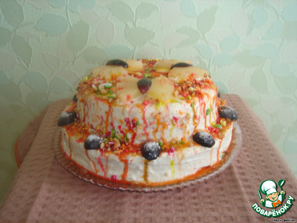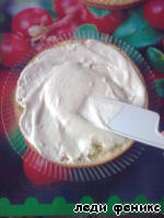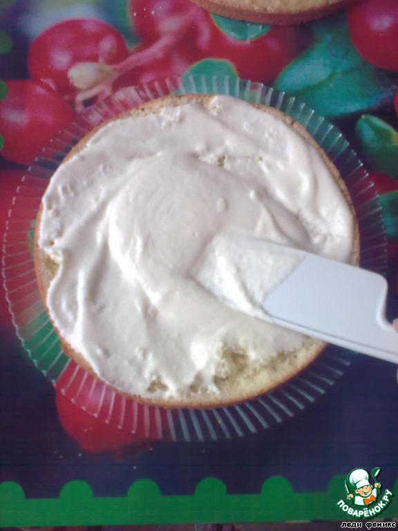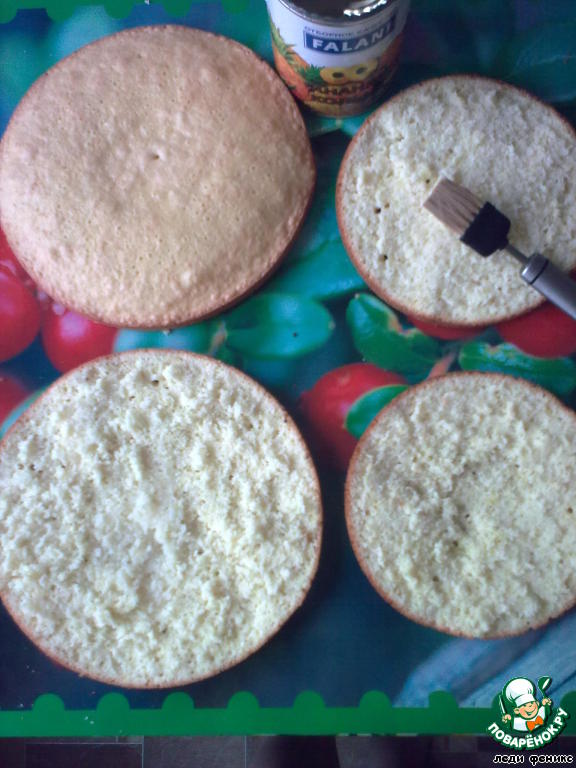 Коржи разрезать горизонтально пополам. Смочить, слегка, соком от ананасов.