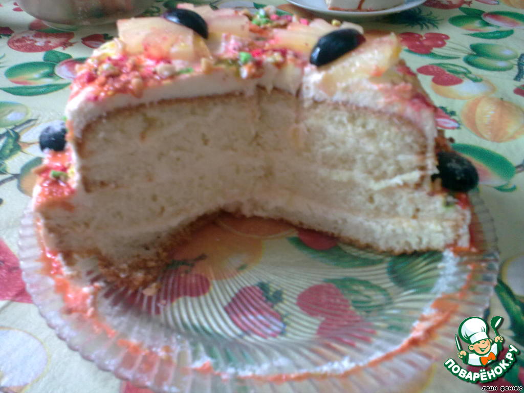 Для украшения сливки взбить с закрепителем и сахаром. Смазать весь торт. Украсить. Я делала бабочки из ананасов и винограда. Усики цедра лимона. Посыпать можно фисташками или любой цветной посыпушкой.