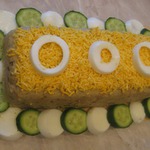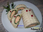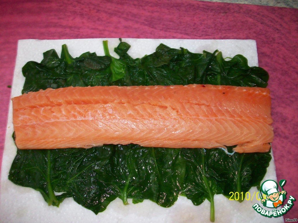 выложить на бумажную салфетку, сверху положить полоску красной рыбы. -