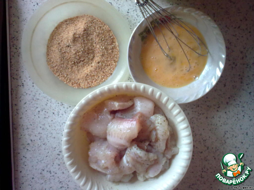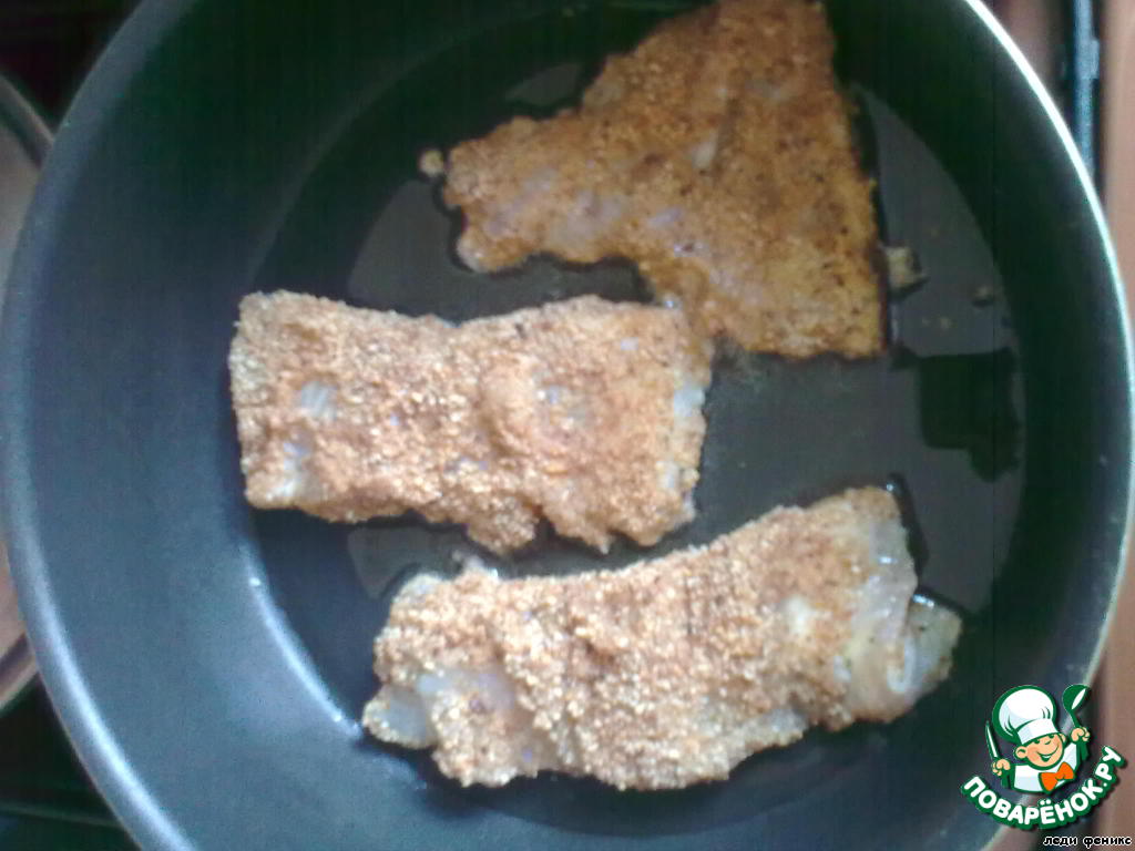 Каждый кусочек рыбы сначала смочить в яйце, затем запанировать в сухарях. И обжарить на медленном огне.