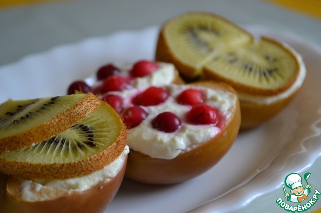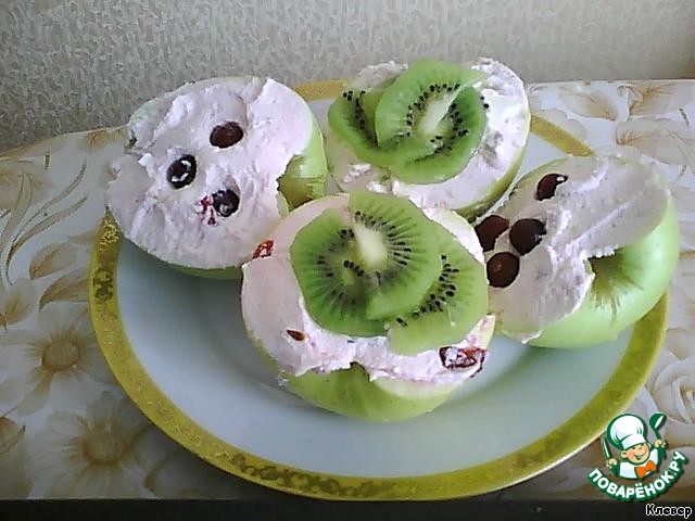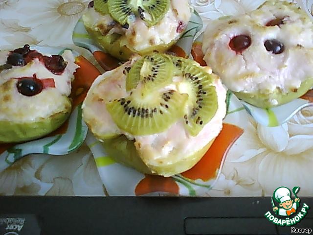 в две, фаршированные массой, половинки яблок