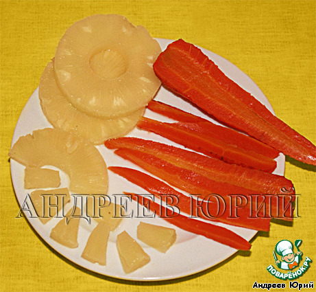 Примерно так кусочками ананаса и моркови оформить вокруг звезды. |