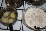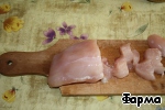 Куриное филе разморозить, нарезать на порционные кусочки (2-3 см), подсолить, варим до готовности.