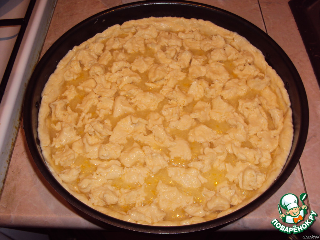 Взять чуть больше половины теста, выложить его в смазанную форму, заходя на борта. Положить сверху лимонную начинку.