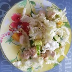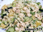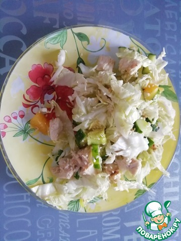 Итак, нарезать кубиками куриную грудку, отваренную в подсоленной воде, свежий огурец, листья пекинской капусты, очищенный и освобождённый от семян апельсин, зелёный лук. Слегка подсолить, поперчить, перемешать.