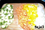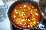 Мясо обжарить с двух сторон. Влить соус и добавить овощи (кроме цуккини) и горошинок 5 душистого перца. Тушим 1 час
