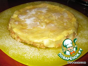И слегка усовершенствовал, делая в полтора раза больше заливки. Выкладываю яблоки и промазывю каждый слой смесью. Верх заливаю так, чтобы получилось 0,5-1,0см. После готовности пирог переворачиваю и получается крепкая основа.