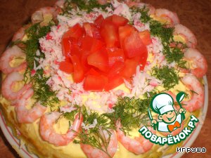 Накрываем последним блинчиком, смазываем майонезом, по кругу выкладываем креветки, по середине - нарезанный помидор.