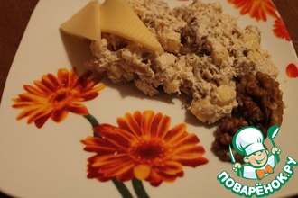 Нарезать мясо кусочками и выложить в салатник, сделать сеточку из майонеза.