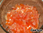 У помидора удалить серединку, нарезать помидор кубиками и выложить на мясо.