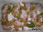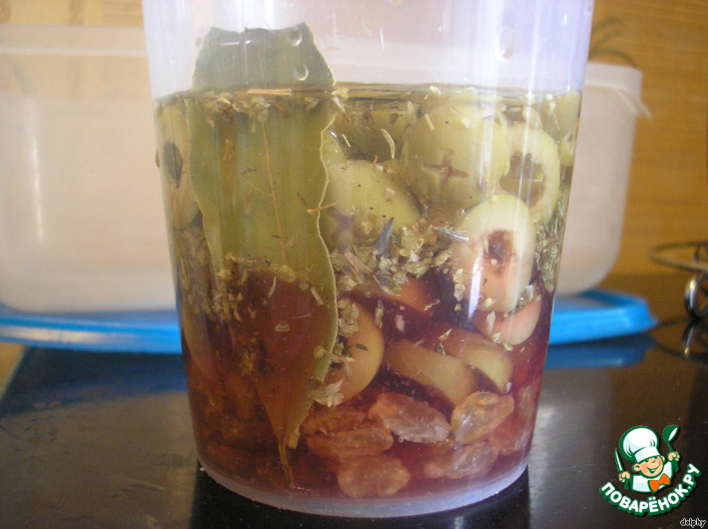Начнем с того, что замаринуем курочку. Для маринада смешаем оливковое масло, уксус, орегано, соль, чесночный порошок, перец, лавровый лист, изюм и оливки.