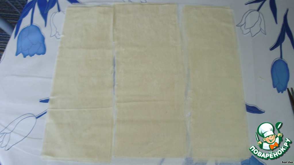 готовое тесто разрезать полосками 10 см шириной и 30 см длиной -