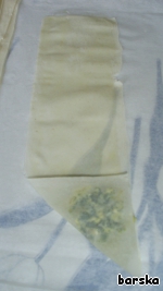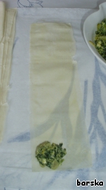 Выкладываем начинку: сначала - 1 ст.л. начинки в нижний левый угол полоски -