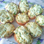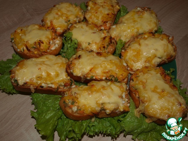 Кусочки батона снизу намазать очень тонким слоем масла, совсем чуть-чуть, буквально втереть, сверху выложить смесь и посыпать тертым сыром.