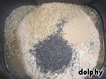 Загружаем все ингредиенты, кроме семян льна, в форму для выпечки согласно инструкции к вашей ХП. В моем Мулинексе последовательность такова: вода, мед, масло, соль, просеянная мука, кунжут, мак, дрожжи. -