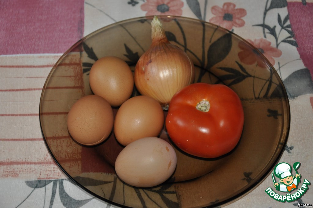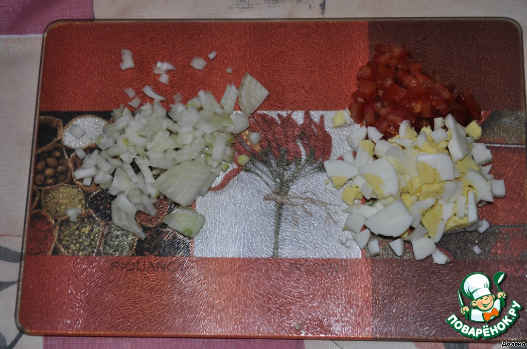 Яйца и помидор порезать кубиком, смешать с обжаренным луком, посолить.