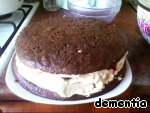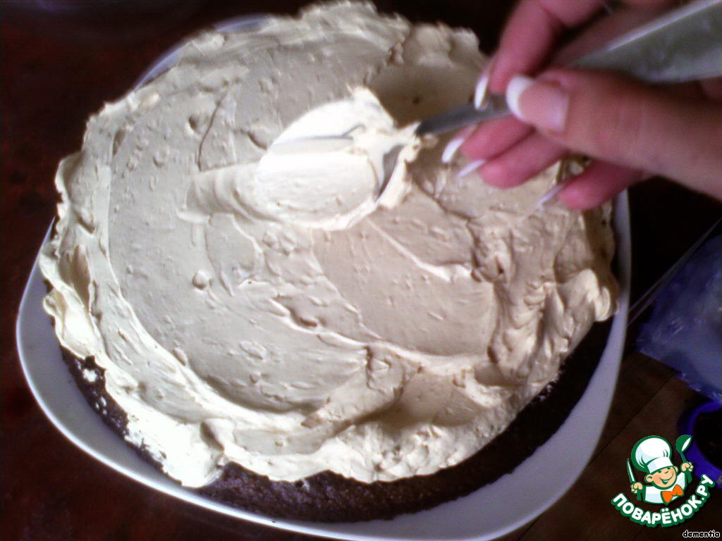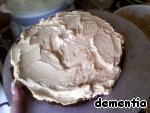 Берем 2-й корж, мажем его нижнюю сторону кремом, чтоб хорошо "приклеилась" к 1-му коржу.