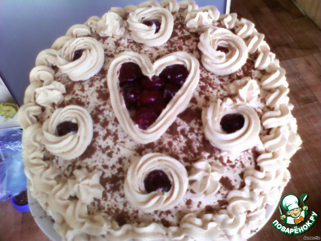 Нежный бисквитный тортик с шоколадной ноткой, вишней и взбитыми сливками. Импровизация - потому, что придумался на ходу - увлеклась и сделала 2 нормы крема для эклеров, не пропадать же добру! А торт разошелся просто на ура :-)