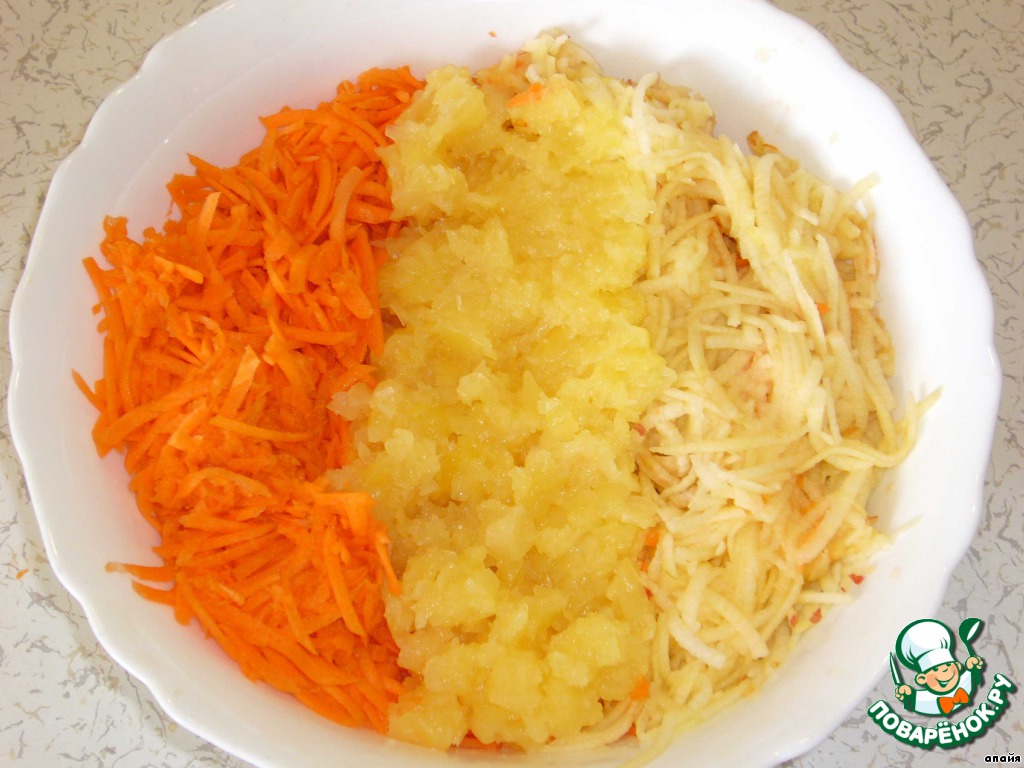 Морковь, яблоки и ананас измельчить на мелкой терке.