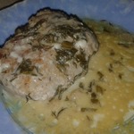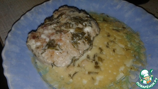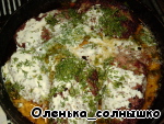 Сладываем в глубокую сковороду с маслом, на котором обжаривали, заливаем соусом, посыпаем зеленью, тушим на маленьком огне примерно 15 минут (какой именно нужен соус, указано не было, так что каждый может выбрать себе по вкусу, я делала так: по 2 ст. л. сметаны и майонеза + 1 ст. л. горчицы, остальное вода, чтобы получилось 1,5 стак., если будет больше, получатся слишком жирные)