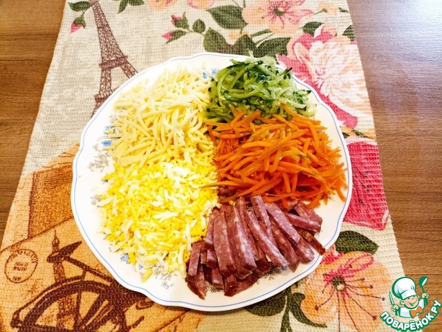 Очень простой салатик. Но вкусный и сытный. Как правило, больше нравится мужичкам, но и дамы за столом отдают ему должное.