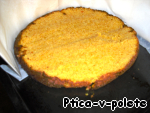 Дать остыть, затем разрезать корж горизонтально на 2 части.
