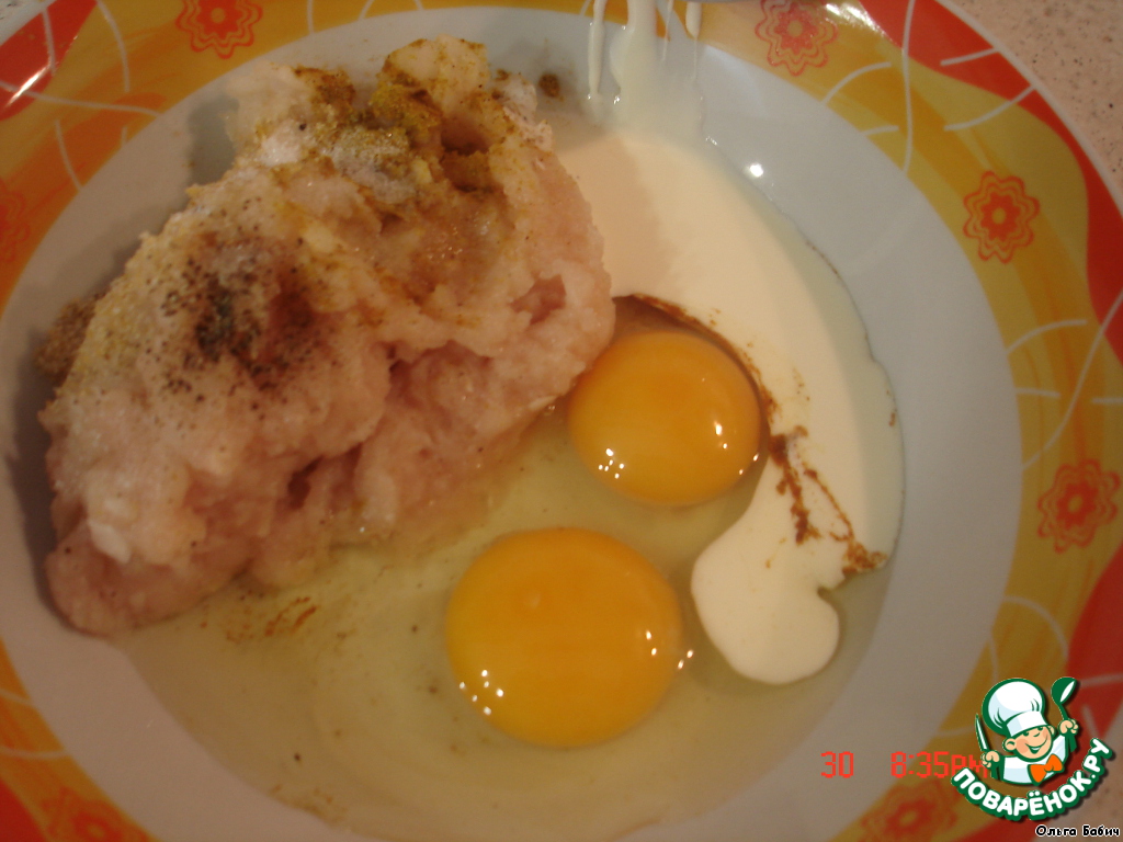 Перемолоть на блендере куриные грудки с луком, добавить яйца, сливки (я делала по отдельности, поэтому на 1 грудку - 2 яйца, 2 ст. л. сливок), добавить специи, хорошо перемешать! |