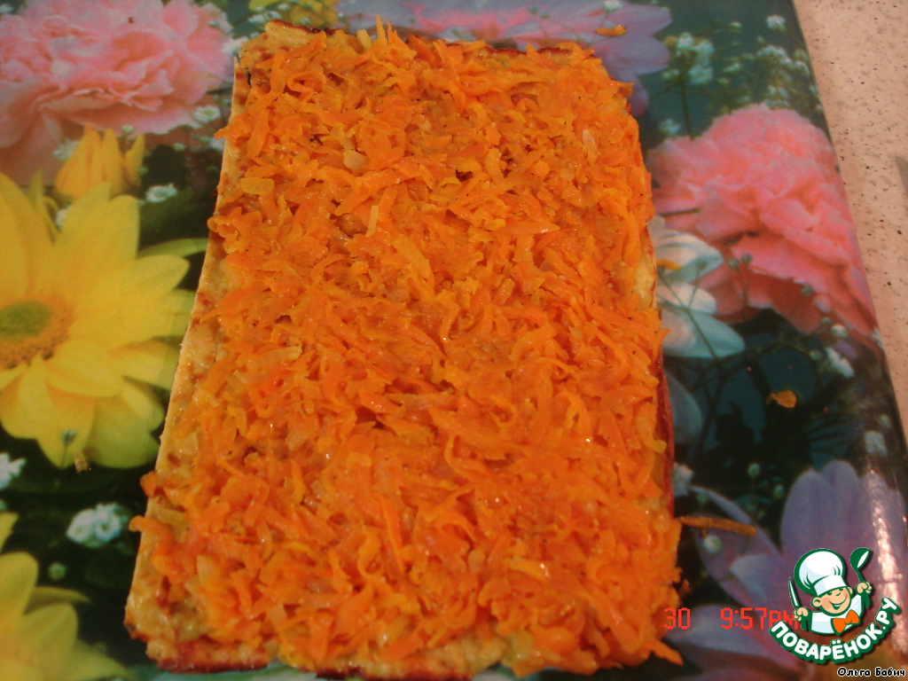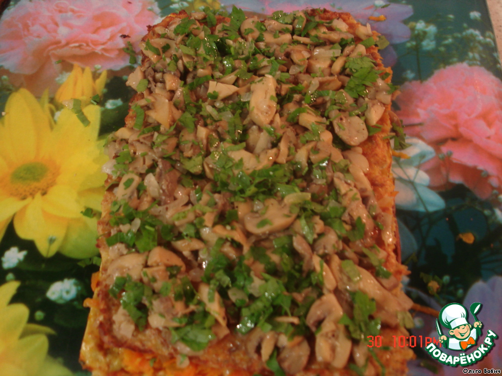 Пока пекутся коржи, пассируем с 1-й половинкой лука морковь, отдельно грибы со 2-й половинкой лука, добавить специи. Коржи разрезать пополам. На 1 корж укладываем остывшую морковь |