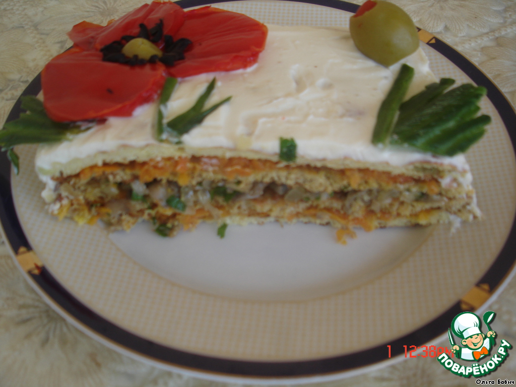 На морковь укладываем корж, на него грибы (я добавила зелени, это по желанию!), дальше корж, на него морковь и накрыть коржом |