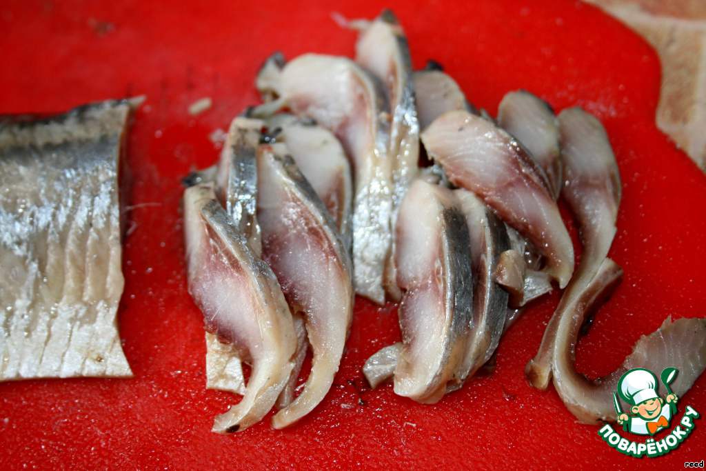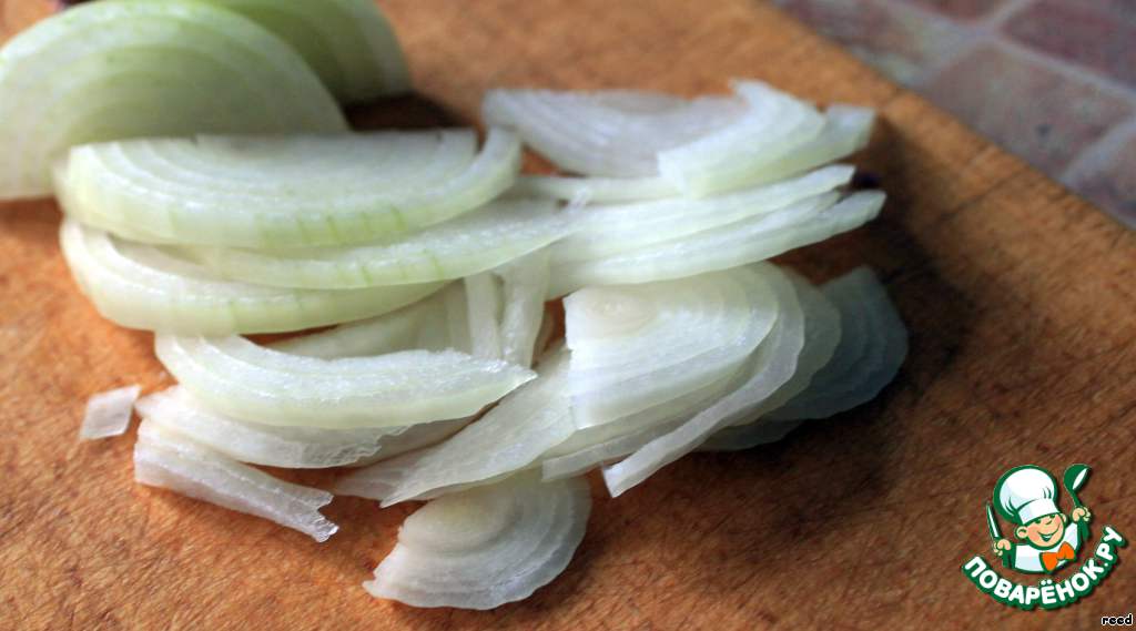 • Лук нашинковать полукольцами и замочить на 20 минут в уксусном растворе (в 1 стакан воды добавить 1/3 стакана уксуса)