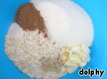 Соедините овсяные хлопья, сахар, какао, коньяк (или воду), ванилин и масло.
