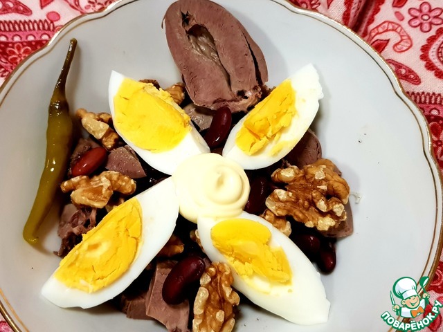 Куриные сердечки отварить в соленой воде с луком. Остудить и нарезать дольками. Отварить фасоль, измельчить грецкие орехи, вареные яйца порезать, всe перемешать, добавить чеснок и заправить майонезом. Салат готов.