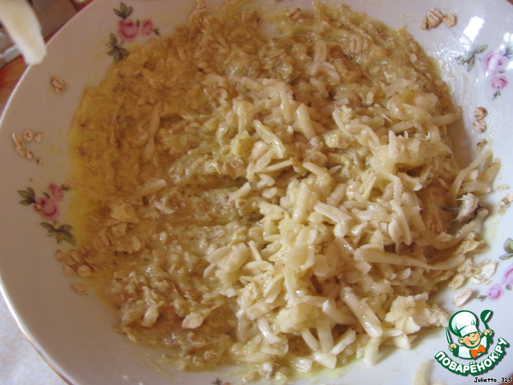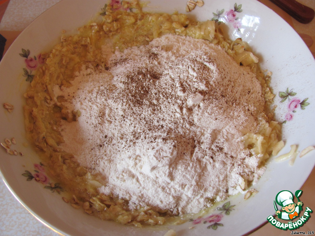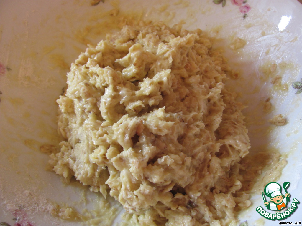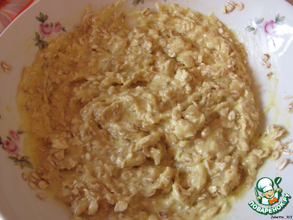 ...замесить не очень крутое тесто. Можно миску накрыть пленкой и поставить на часик в холодильник, чтобы хлопья "разбухли" и стали мягче.