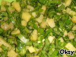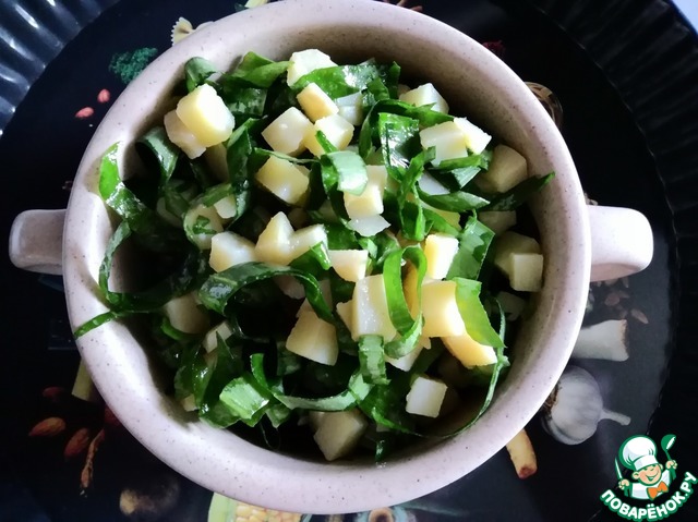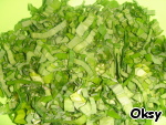 Промытую и обсушенную черемшу порезать соломкой. Добавить к картофелю.