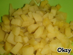 Отварной картофель очистить и нарезать кубиками.