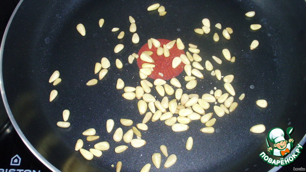 Слегка обжарить на сухой сковородке орешки пинии (кедровые)