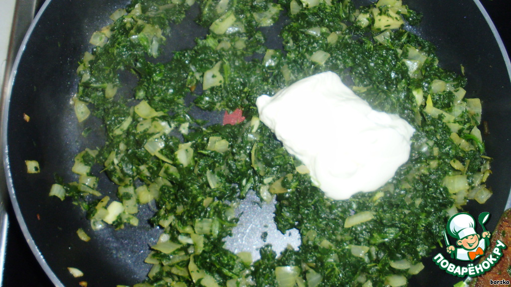 К луку добавить шпинат, протушить до испарения жидкости.