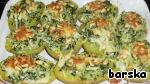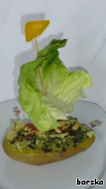 Серединки картофеля измельчить и смешать со шпинатно-сметанно-творожной массой, посолить и поперчить, начинить половинки картофеля
