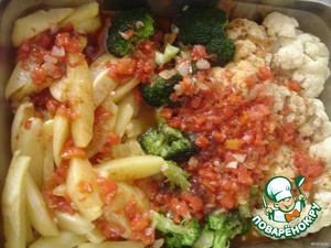Смешать все ингредиенты для соуса. Выливаем поверх овощей и запекаем в духовке 180 С на 15-20 мин.
