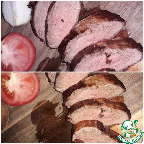 Хрустящая снаружи и розовая внутри утиная грудка. Нашла в интернете. В оригинале используется китайская приправа 5 специй, но я по-своему намешала. Хочу сказать, что одной грудки мало (маринада хватит и на две), т. к. после пропаривания она с 400 гр уменьшилась до 270 гр.