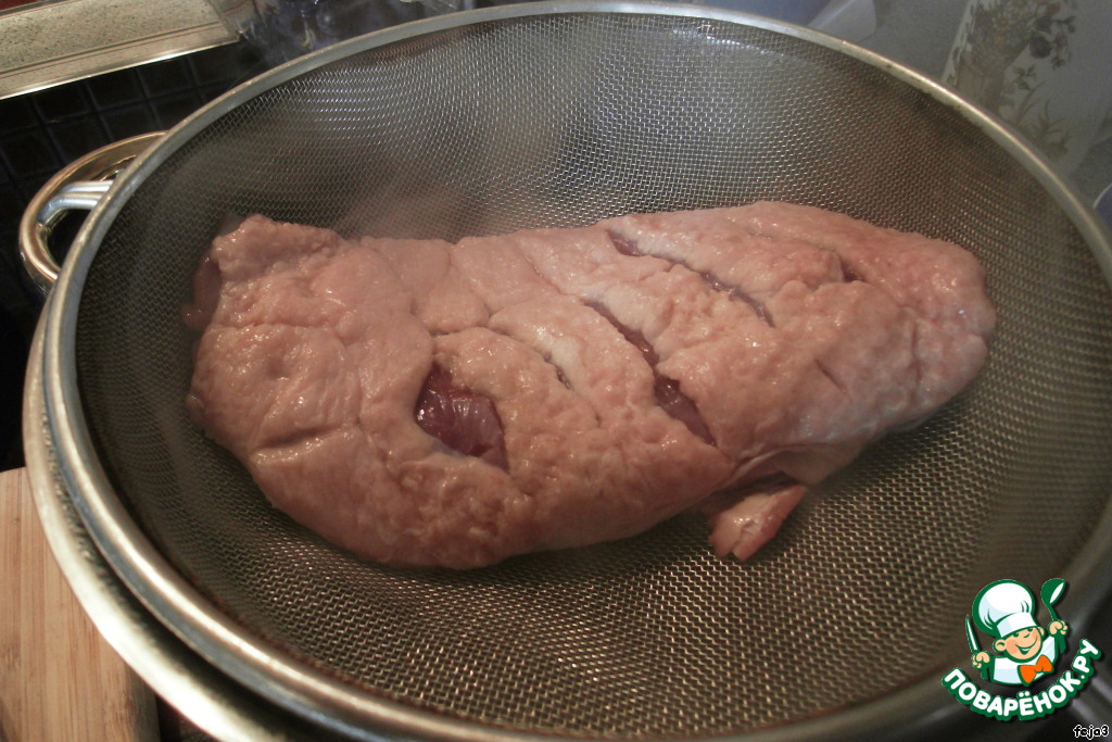Отправить утку в пароварку на 18 мин. У кого нет, обходимся подручными средствами (как у меня, например, кастрюля, друшлаг, крышка).