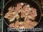Добавить лук, сельдерей и перец, мелко нарезанный шпик