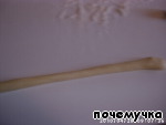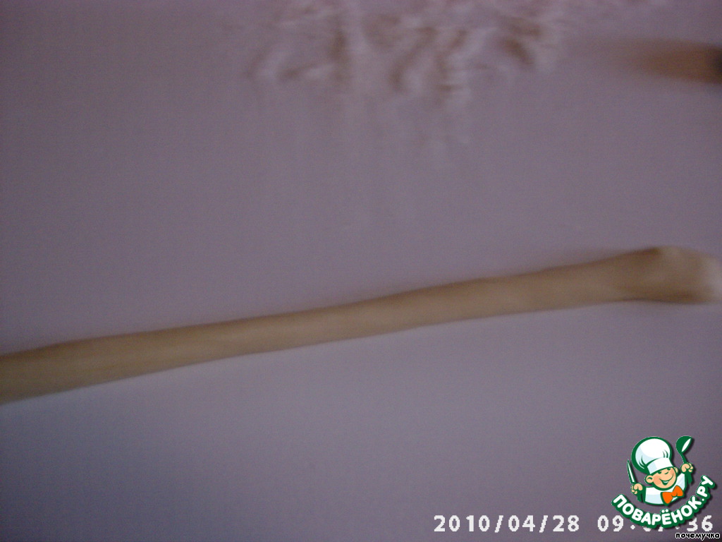 Затем сформировать из теста колбаску и нарезать поперек на кусочки величиной с грецкий орех. После этого из каждого кусочка руками сформировать жгутики величиной с карандаш. Затем каждый жгутик растянуть в тонкую ленту. Можно просто раскатать скалкой, а в первоисточнике их растягивают, держа за оба конца и ударяя серединой о доску.