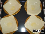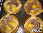 Вынуть слойки. На дно каждой выложить горчицу, смешанную с тертым сыром, следом вбить 2 яйца и выложить подрумяненную свинину. Накрыть смоченным в воде пергаментом и поставить в духовку еще на 15-20 минут.