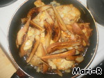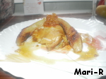 на сковороде с подливой растопить мед. Потом выложить обратно курицу, лук и груши, оставить немного потомиться. -