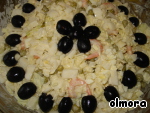 Сверху салат украшаем маслинами.