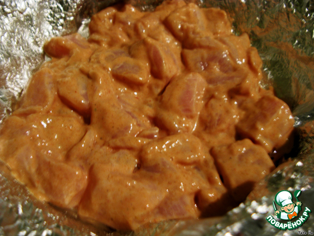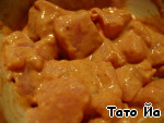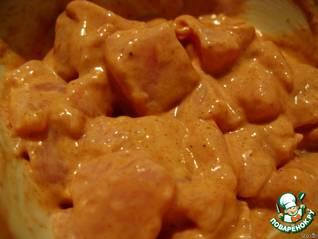 Делаем маринад: соединим кетчуп, майонез и соевый соус. Добавим курочку, хорошенько перемешаем, добавим приправки любимые (у меня карри), посолим-поперчим.