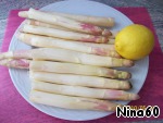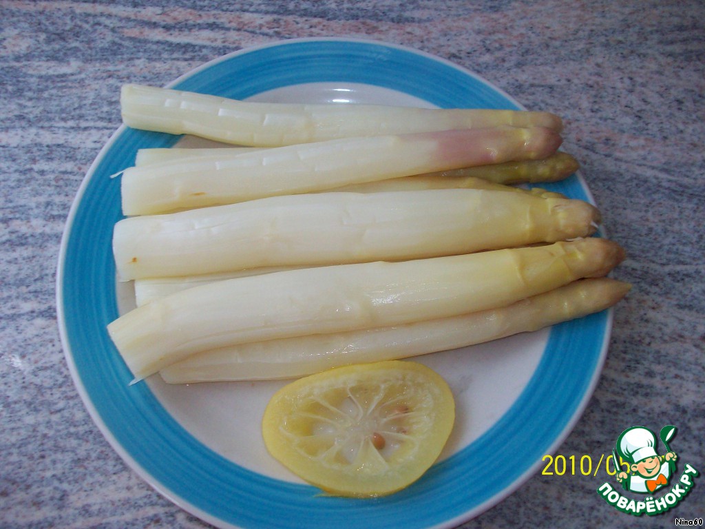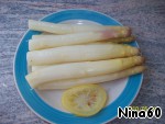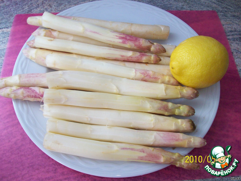 Спаржу очистить, сварить с пластиком лимона, соли и сахара 20 минут.