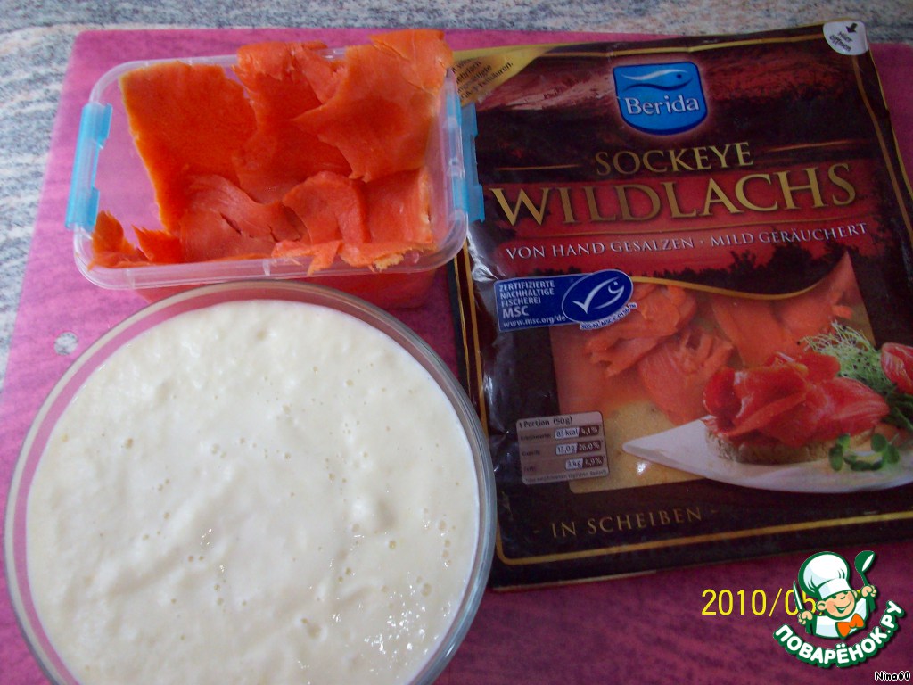 - Рыба (красная, нарезать тонко или купить готовую нарезку) — 250 г