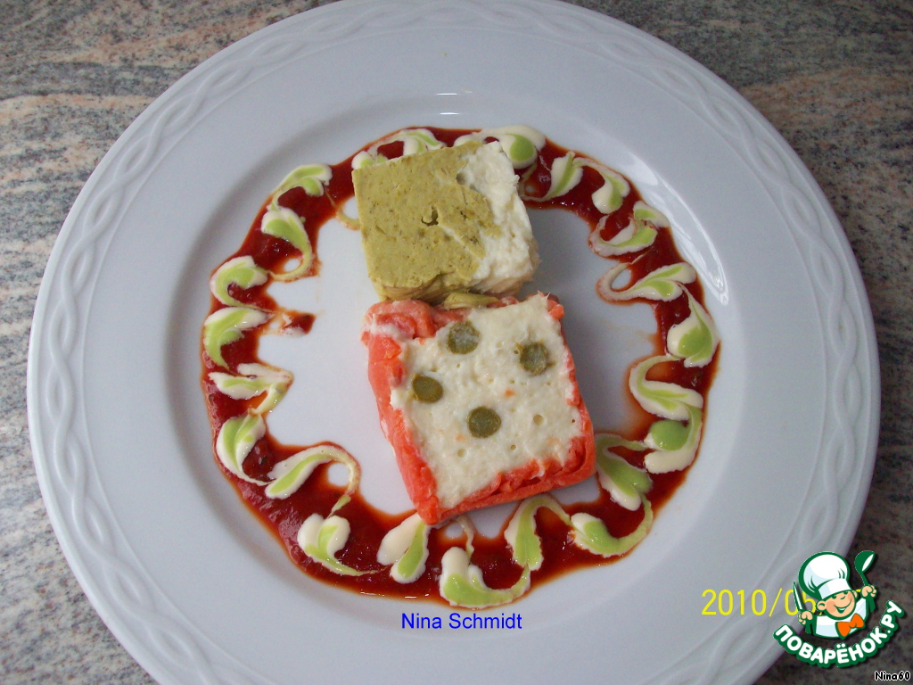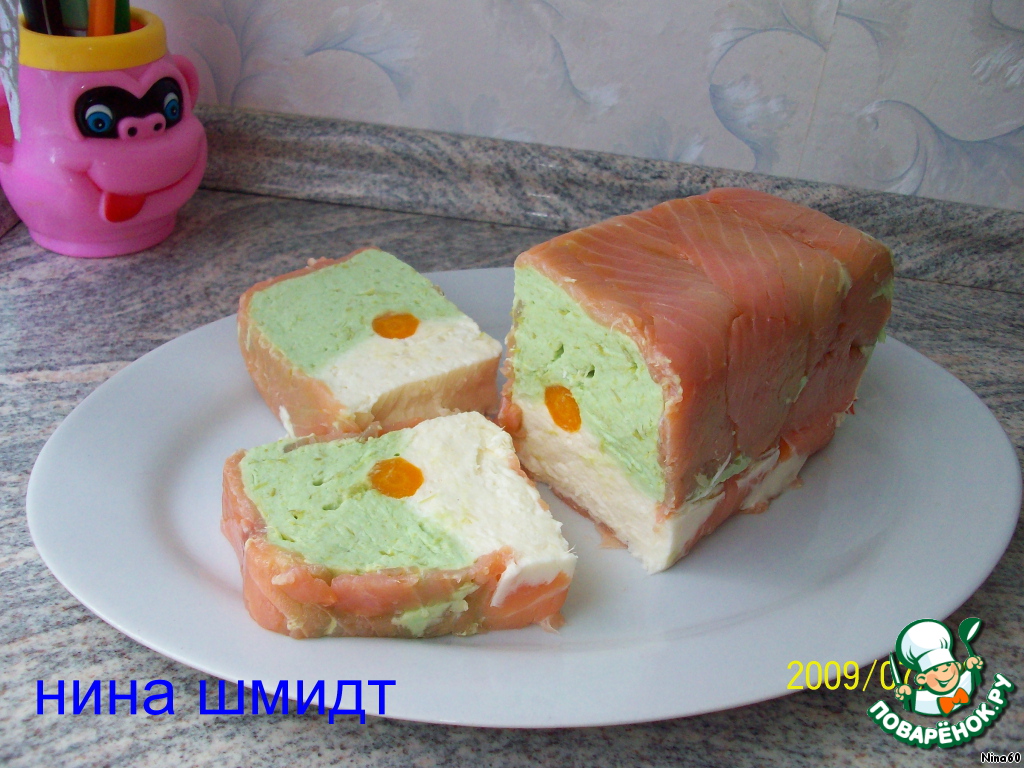 Любую формочку обтянуть пищевой плёнкой, выложить пластиками рыбу. -